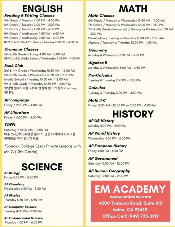 EM Academy/얼바인 Irvine USR 입시학원 0 0 2024.06.15 09:59 http://emirvine.com/index.aspx + 342 입시학원 유치원 대입종합컨설팅SAT ACT AP SAT IIESL TOEFLKids Academy949-735-3919오렌지카운티 OC 터스틴 Tustin산타아나 Santa Ana 어바인 전화걸기 0 #업소록닷컴 Upsorok.com #생활정보 TheKoreatown.com #부동산 알나무 Rtree.com #미국여행 #미국생활