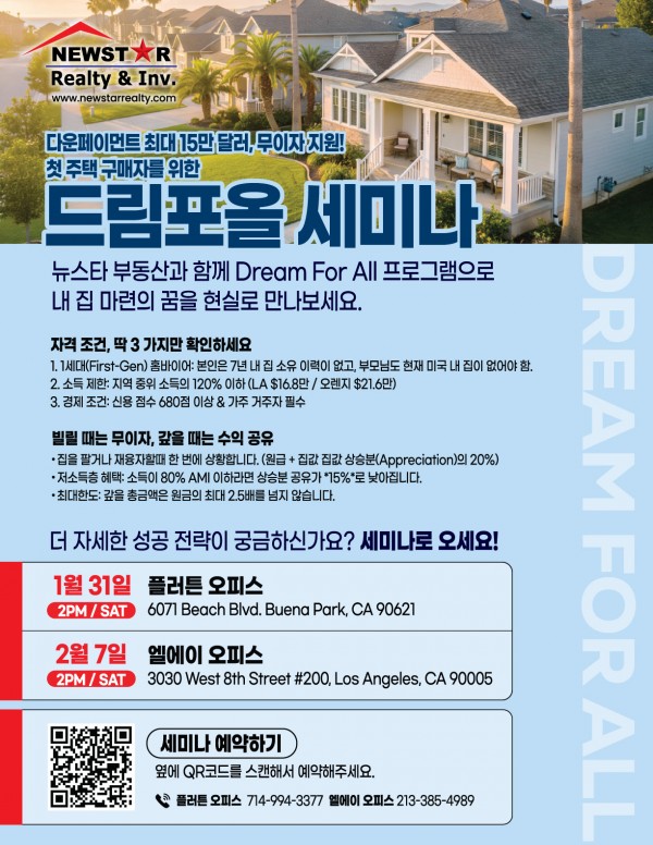 내 돈 없이 내 집 마련? 최대 15만 불 무이자 지원 뉴스타 '드림 포 올' 세미나에 초대합니다!
