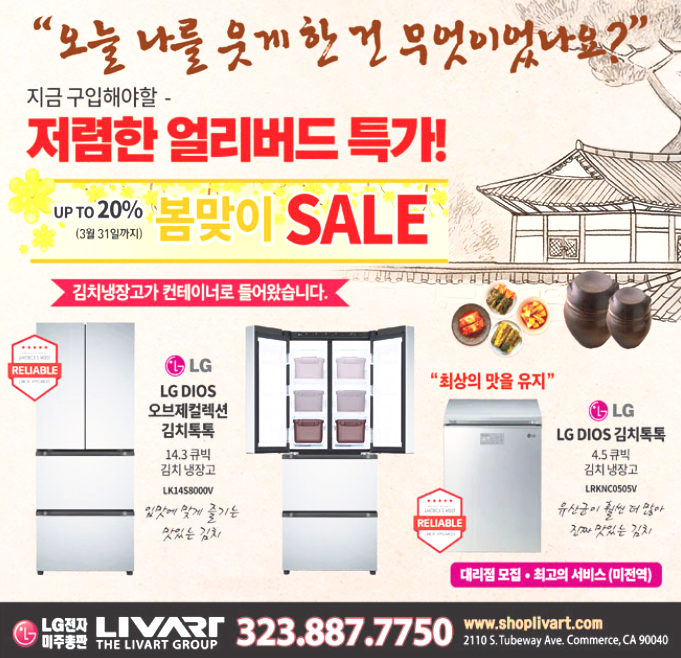 새봄을 맞아 LG리바트가 LG DIOS 김치톡톡 김치냉장고 봄맞이 특별 세일을 진행한다. 이번 프로모션은 오는 31일까지 진행되며 인기 김치냉장고 모델을 최대 20% 할인된 가격으로 만나볼 수 있다.