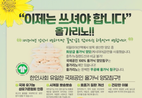 건강한 수면 환경을 위한 프리미엄 침구 브랜드 올가리노(대표 백영번)가 다양한 제품을 파격적인 가격에 선보여 고객들의 관심을 모으고 있다. 국제 유기농 인증 양모를 사용한 올가리노 제품은 뛰어난 통기성과 보온성을 갖춘 것이 특징으로, 사계절 내내 쾌적한 수면 환경을 제공한다.